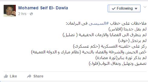 وعلق سيف الدولة على الخطاب بمنشور على صفحته بموقع التواصل الاجتماعي “فيس بوك”: “لم يقل جديدًا “إفلاس”، لم يتطرق إلى القضايا والأزمات الحقيقية “تضليل”، لم يرتجل “خوف”، ركز على خلفيته العسكرية “حكم عسكري”، خَص الجيش والشرطة والقضاء بالتحية “نظام مبارك والدولة العميقة”، لم يذكر ثورة يناير “ثورة مضادة”، تصفيق وتهليل ونفاق النواب “فلول”.