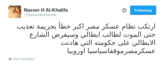 أكد الدبلوماسي القطري، ناصر الخليفة، أن النظام المصري ارتكب خطأ فادحًا بتعذيب الطالب الإيطالي جوليو ريجيني.