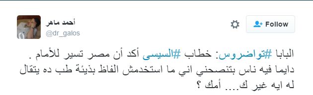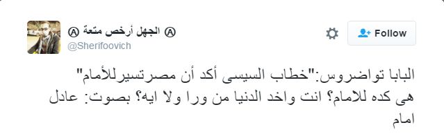 وعلق مغردون على تصريحات “تواضروس” بأن مصر تسير للأمام، بتعليقات ساخرة، وكان من بينها.. حمد ماهر: البابا تواضروس: خطاب السيسي أكد أن مصر تسير للأمام.. دايما فيه ناس بتنصحني إني ما استخدمش ألفاظ بذيئة طب ده يتقال له ايه؟؟