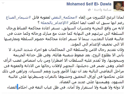 وتساءل سيف الدولة: “لماذا انزعج الكثيرون من إلغاء محكمة النقض لعقوبة قاتل شيماء الصباغ، رغم أنها سبق أن ألغت أيضًا أحكام الإعدام بالجملة؟”.