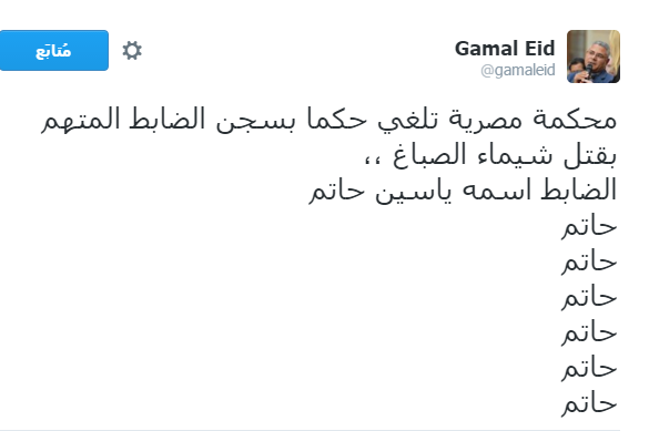 أما الناشط الحقوقي “جمال عيد” فاستنكر قرار محكمة النقض بإلغاء حكم حبس الضابط.