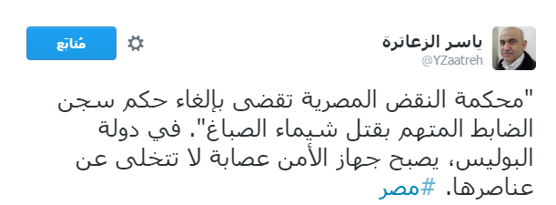 وامتعض الكاتب الفلسطيني ياسر الزعاترة من قرار محكمة النقض بإلغاء حكم حبس الضابط.
