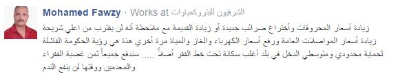 Mohamed Fawzy –: “زيادة أسعار المحروقات واختراع ضرائب جديدة أو زيادة القديمة مع ملاحظة أنه لن يقترب من أعلى شريحة، زيادة أسعار المواصلات العامة ورفع أسعار الكهرباء والغاز والمياه مرة أخرى.. هذه هي رؤية الحكومة الفاشلة لحماية محدودي ومتوسطي الدخل في بلد أغلب سكانة تحت خط الفقر أصلًا.. سندفع جميعًا ثمن غضبة الفقراء والمعدمين ووقتها لن ينفع الندم”.