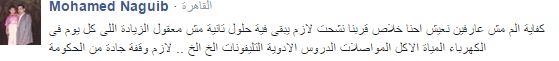 Mohamed Naguib –: “كفاية ألم مش عارفين نعيش احنا خلاص قربنا نشحت، لازم يبقى فيه حلول تانية مش معقول الزيادة اللي كل يوم في الكهرباء.. المياه.. الأكل.. المواصلات.. الدروس.. الأدوية.. التليفونات إلخ إلخ.. لازم وقفة جادة من الحكومة”.