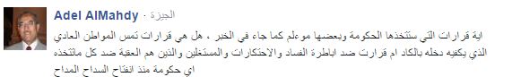 Adel AlMahdy –: “إيه قرارات التي ستتخذها الحكومة وبعضها مؤلم كما جاء في الخبر، هل هي قرارات تمس المواطن العادي الذي يكفيه دخله بالكاد؟ أم قرارت ضد أباطرة الفساد والاحتكارات والمستغلين؟ والذين هم العقبة ضد كل ماتتخذه أي حكومة منذ انفتاح السداح المداح”.