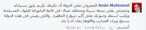– amin : المفروض على الدولة أن تكرمك تكريم يليق بسيادك وتحصلى على نجمة سيناء ونحطلك تمثال في قاعة البانوراما للقوات المسلحة ويكتب اسمك وصورتك على أكبر شوارع القاهرة