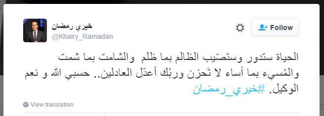 وقال رمضان في تغريدته: “الحياة ستدور وستصيب الظالم بما ظلم والشامت بما شمت والمُسيء بما أساء لا تَحزن وربك أعدل العادلين.. حسبي الله ونعم الوكيل”.