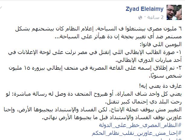قال البرلماني السابق زياد العليميك إن واقعة مقتل وتعذيب الطالب الإيطالي جوليو ريجيني، ستؤثر في السياحة المصرية، مشيرا إلى أن “٦ ملايين مصري بيشتغلوا في السياحة، إعلام النظام كان بيشحنهم بشكل مستمر ضد أي تغيير بحجة إن دا هيأثر على السياحة”.