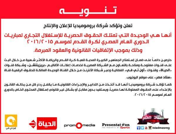 وأصدرت شركة “بروموميديا” تنويها بتلك الإجراءات التي قامت بها بمعاونة القنوات المالكة لبث مباريات الدوري المصري.