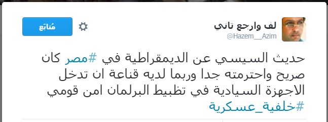 سخر الناشط السياسي الدكتور حازم عبدالعظيم، من حديث السيسي عن الديمقراطية، وذلك خلال تغريدة نشرها اليوم، عبر صفحته الشخصية بموقع التغريدات القصيرة “تويتر”.