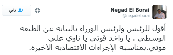 وعلق على الإجراءات الاقتصادية الأخيرة للحكومة المستهدفة رفع الدعم عبر حسابه على موقع التواصل الاجتماعي “تويتر” قائلا “يا واخد قوتي يا ناوي على موتي”.