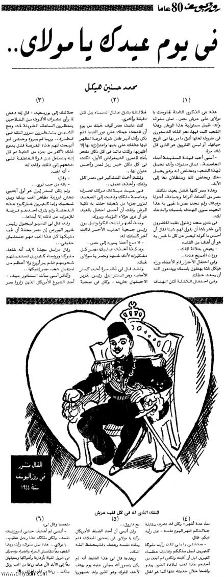 كتب هيكل عن فاروق في مجلة روز اليوسف في فبراير سنة 1944 أثناء انتشار مرض الكوليرا تحت عنوان “إنه الفاروق… الملك في الصعيد يزور مناطق المرض بنفسه ليشرف على ما يجري وليواسي شعبه… هذا هو النبأ العظيم الذي لم يدهش له أحد ولم يعجب له أحد ولكن الناس جميعا أضاءت عيونهم بنور الأمل والثقة وتقابلت أنظارهم فتبسموا ابتسامة حب وحنان إنه الفاروق… إنه الفاروق دائما”.