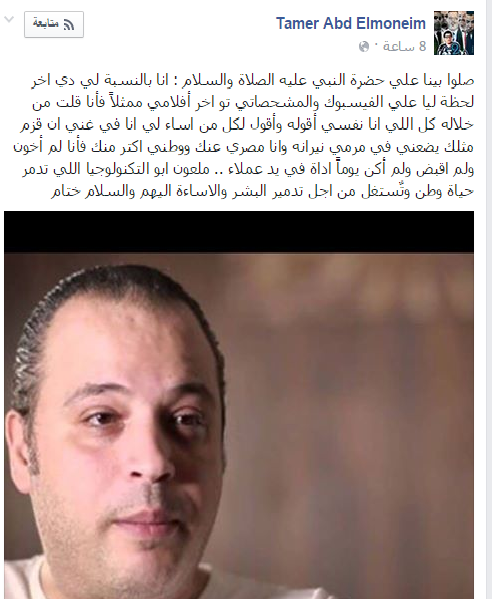 وأضاف “عبدالمنعم”: “أقول لكل من أساء لي أنا في غنى أن قزم مثلك يضعني في مرمى نيرانه، وأنا مصري عنك ووطني أكتر منك فأنا لم أخون ولم أقبض ولم أكن يومًا أداة في يد عملاء، ملعون أبو التكنولوجيا اللي تدمر حياة وطن وتٌستغل من أجل تدمير البشر والإساءة إليهم والسلام ختام”.