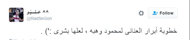 عَــلِـــيُـو: “خطوبة أبرار العناني لمحمود وهبة، لعلها بشرى”.