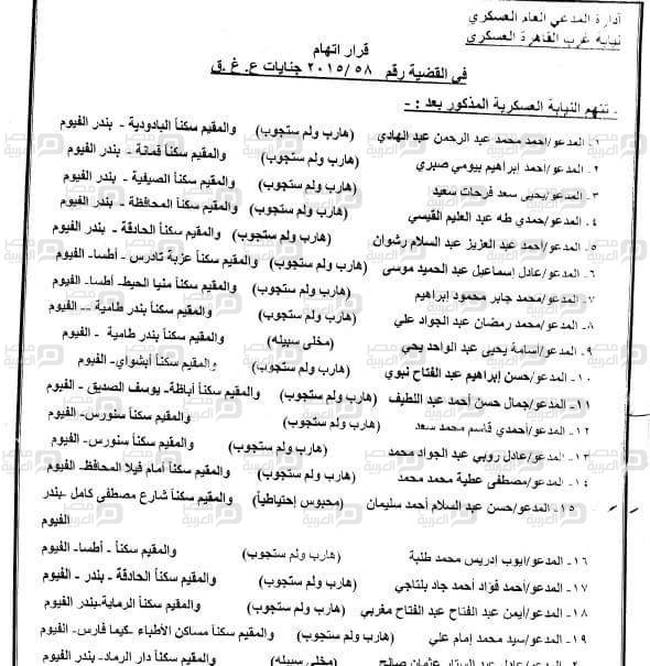 وفقًا لقرار الإحالة، فإنه لم يتم استجوابه في القضية، والتي واجه فيها تهمًا بقتل 4 أشخاص، والشروع في قتل 8 باستخدام الأعيرة النارية، وتعمد تخريب ممتلكات حكومية “مديرية الصحة بالفيوم” واستعمال القوة والعنف وتهديد أفراد الجيش والشرطة وإتلاف عمد لممتلكات الشرطة “سيارات”.