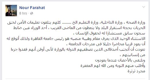 أكد الفقية الدستوري نور فرحات، أن وزارات الحكومة المصرية تنفذ تعليمات أمنية لخنق الحريات، وذلك خلال تعليق نشره عبر صفحته الشخصية بموقع التواصل الاجتماعي "فيس بوك"