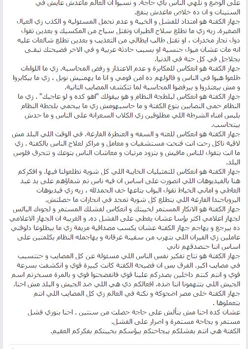 واختتم مؤكدا أن الهدف الأساسي من اهتمامه بأمر حدث منذ عامين هو كشف فشل الدولة المستمر وبجاحتها في الإصرار على الفشل.
