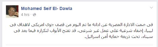 أكد الباحث السياسي محمد سيف الدولة أن عدم إدانة مصر القصف الأميركي لليبيا، له تبعات خطيرة على أمن مصر القومي، وذلك من خلال تعليق نشره، اليوم الجمعة، عبر صفحته الشخصية بموقع التواصل الاجتماعي “فيس بوك”.