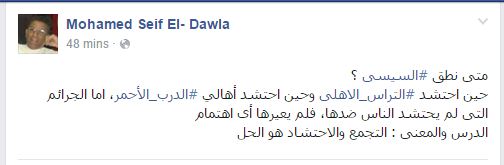 وأشار “سيف الدولة” إلى أن السيسي لم يهتم سوى بالقضايا التي صاحبها غضب جماهيري، وتجمهر وتظاهر المواطنين من أجلها، ضاربًا المثل بغضب “ألتراس أهلاوي”، ثم غضب أهالي الدرب الأحمر، مؤكدًا أن التجمع والاحتشاد هو الحل.