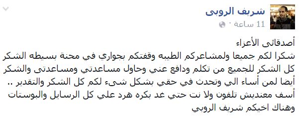 توجه شريف الروبي، القيادي بحركة 6 أبريل، بالشكر لكل من سانده ووقف بجانبه خلال فترة اعتقاله؛ حيث قال: “أصدقائي الأعزاء.. شكرا لكم جميعا ولمشاعركم الطيبة، وقفتكم بجواري في محنة بسيطة، الشكر كل الشكر للجميع من تكلم ودافع عني وحاول مساعدتي ومساعدتي”.