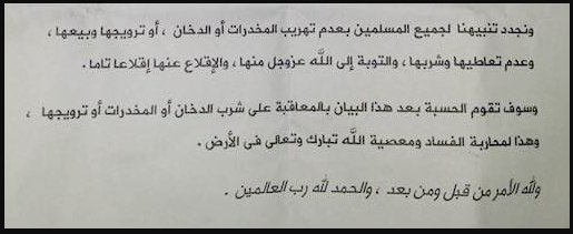 تداول مستخدمو مواقع التواصل الاجتماعي، صورًا لبيان وزعته ما يسمى بـ “الشرطة الإسلامية برفح” التابعة لـ”ولاية سيناء” الفرع المصري لتنظيم الدولة؛ حيث حددت فيه قوانينها ونبهت على المواطنين بعدم مخالفتها.