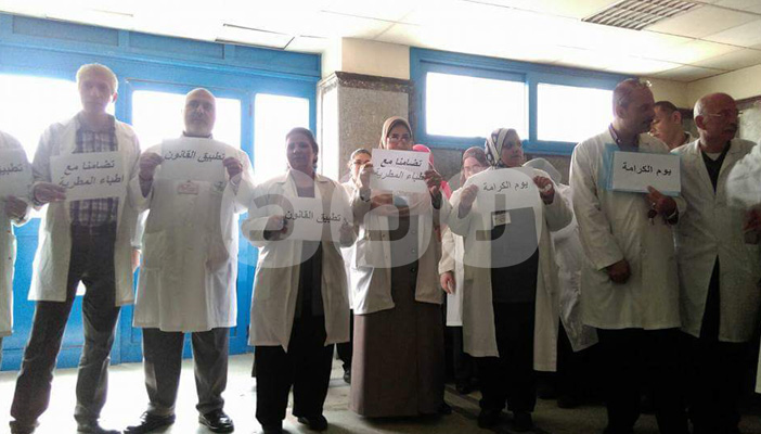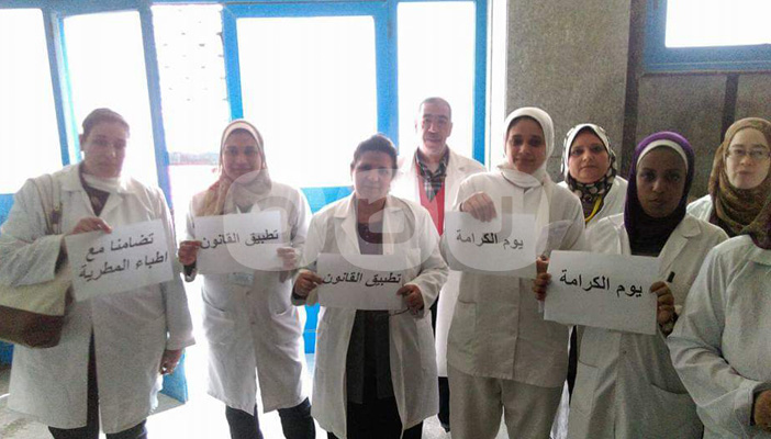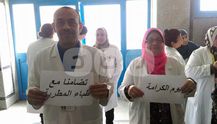 وقام الأطباء برفع عدد من اللافتات من بينها، “ندعم النقابة العامة لوقف الاعتداء على الأطباء”، “نعم لقانون حماية المستشفيات”، “متضامن مع أطباء المطرية”، “يوم الكرامة”، “للأطباء كرامتهم فلنكافح للحفاظ عليها”.