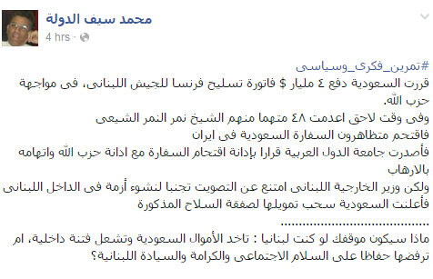 وأوضح “سيف الدولة” في منشور له عبر حسابه الشخصي بموقع التواصل الاجتماعي “فيس بوك أن “السعودية قررت وقف دفع الـ٤ مليارات دولار التي كانت تعدها كـ”فاتورة تسليح” فرنسا للجيش اللبناني، في مواجهة حزب الله، بعد أن قام وزير الخارجية اللبناني جبران باسيل، بالامتناع عن التصويت على القرار الذي أصدره وزراء الخارجية العرب في ختام اجتماعهم الطارئ، حول دعم السعودية ضد إيران، وذلك تجنبًا لنشوب أزمة في الداخل اللبناني”.