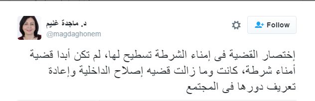 رأت ماجدة غنيم، الخبير الدولي في التنمية واستشاري التنمية الدولية، أن اختصار قضية تجاوزات الشرطة في أمناء الشرطة تسطيح لها؛حيث قالت -في تغريدة لها على حسابها في موقع “فيس بوك”-: “اختصار القضية في أمناء الشرطة تسطيح لها، لم تكن أبدًا قضية أمناء شرطة، كانت وما زالت قضية إصلاح الداخلية وإعادة تعريف دورها في المجتمع”.