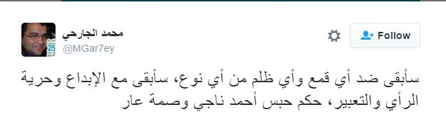 اعتبر الكاتب الصحفي محمد الجارحي أن حبس الروائي أحمد ناجي بتهمة خدش الحياء بمثابة وصمة عار؛ حيث قال في تغريدة له على “تويتر”: “سأبقى ضد أي قمع وأي ظلم من أي نوع، سأبقى مع الإبداع وحرية الرأي والتعبير، حكم حبس أحمد ناجي وصمة عار”.