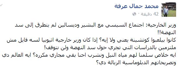 أعرب الكاتب الصحفي محمد جمال عرفة عن دهشته من تصريح وزير الخارجية المصري أن اجتماع السيسي مع البشير وديسالين في شرم الشيخ لم يتطرق إلى سد النهضة.