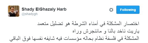 رأى الناشط السياسي شادي الغزالي حرب، أن اختصار أزمة تجاوزات وزارة الداخلية في أمناء الشرطة تضليل متعمد، قائلًا -في تغريدة له على “تويتر”-: “اختصار المشكلة في أمناء الشرطة هو تضليل متعمد”، مضيفًا “ياريت ناخد بالنا وماننجرش وراه، المشكلة في فلسفة نظام بحاله، مؤسسات فيه شايفة نفسها فوق الباقي”.
