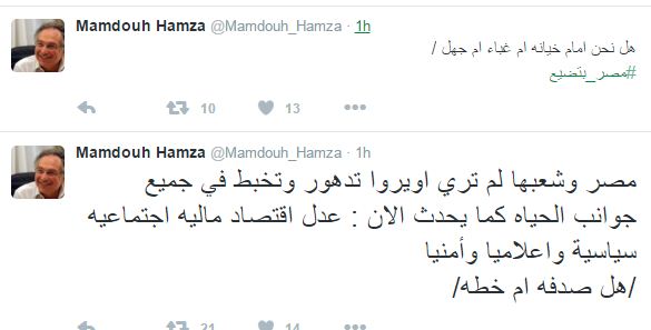 وتساءل “حمزة” في نهاية تغريدته قائلا: “هل صدفة أم خطة؟”، متسائلا أيضا في تغريدة أخرى: “هل نحن أمام خيانة أم غباء أم جهل؟”، وأتبعها بهاشتاج #مصر_ بتضيع.