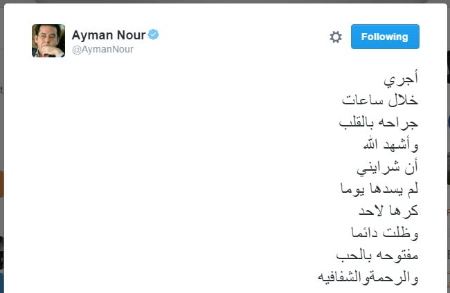 أكد الدكتور أيمن نور، رئيس قناة “الشرق” الفضائية، أنه سيجري عملية جراحية في القلب، وذلك من خلال تغريدة نشرها عبر حسابه الشخصي بموقع التغريدات القصيرة “تويتر”.