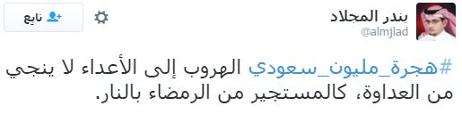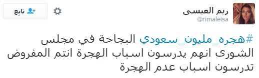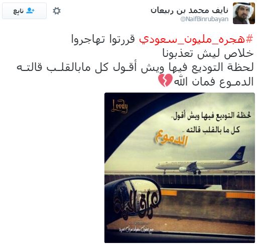 أطلق مغردون هاشتاجًا على موقع التواصل الاجتماعي "تويتر"، حمل اسم "هجرة مليون سعودي"، للتعبير عن غضبهم إزاء ارتفاع نسبة البطالة في المملكة،