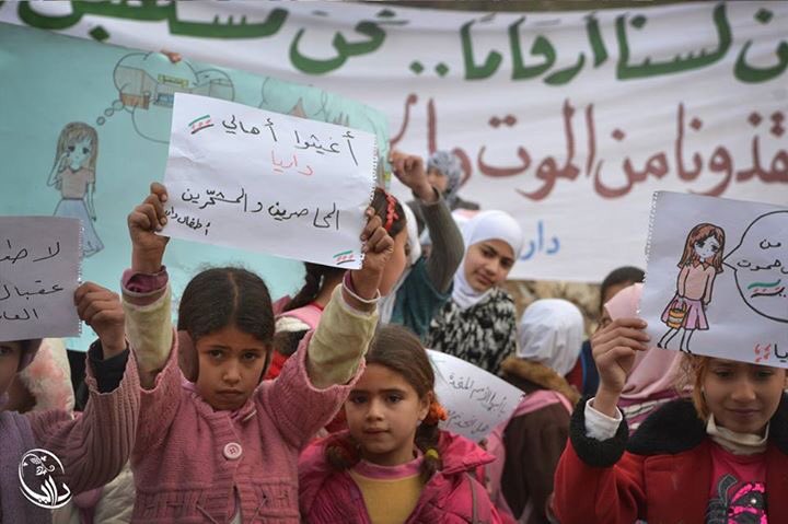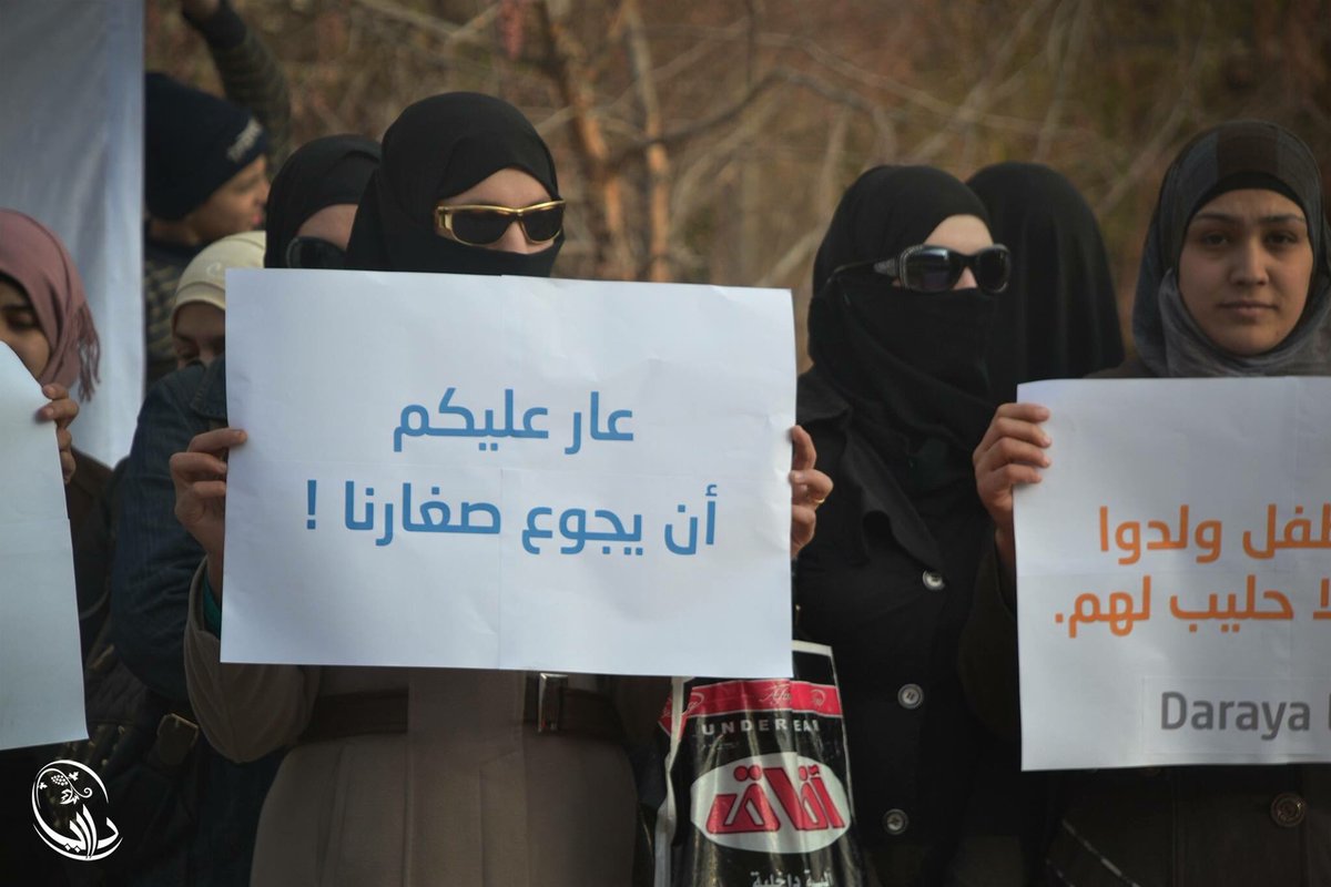تداول العديد من رواد مواقع التواصل الاجتماعي، صورا لعشرات من النساء والأطفال الذين خرجوا في اعتصام للمطالبة بفك الحصار عن مدينتهم، ووقف القصف اليومي الذي يهدد حياتهم، ونشر الحساب الرسمي للمدينة على موقع التواصل الاجتماعي “تويتر”، العديد من صور الاعتصام.