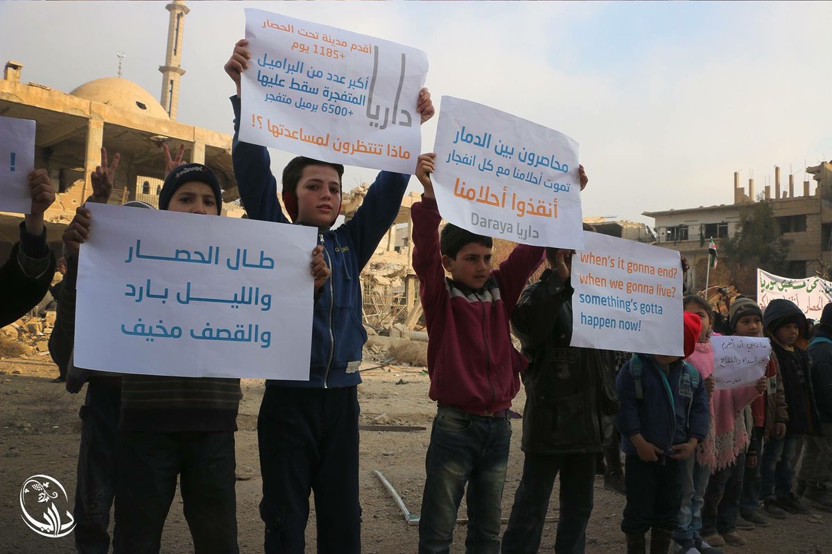 ورفع المعتصمون لافتات تذكر بالواقع الإنساني الصعب الذي يعيشوه، في ظل الحصار والقصف، واحتوت إحدى اللافتات على عبارة “نحن لسنا أرقامًا، نحن مستقبل سوريا، أنقذونا من الموت والحصار، أنقذوا مستقبلكم”.