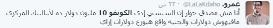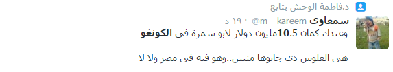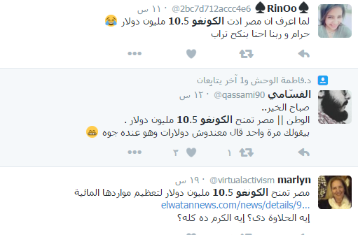 وتبلوت آراء مواقع التواصل الاجتماعي في التأكيد على فشل السيسي والحكومة في إدارة البلاد، وسط تعجب من ادعاء عبدالفتاح السيسي عدم قدرة الحكومة على دعم المياه في حين أنه يسارع بإعطاء هذا الملبغ الضخم لدولة الكونغو.