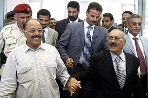 وكان الركن الأحمر، قد أعلن في (21 مارس 2011م)، تأييده للثورة اليمنية، وانضم إلى المعارضة ونشر قوات الفرقة الأولى مدرع، لحراسة متظاهري ميدان التغيير؛ ليشكل بذلك ضربة موجعة للمخلوع صالح ونظامه، لا سيما بعد سيل الانضمامات الكثيرة للثورة من القادة العسكريين المختلفين مع النظام القائم آنذاك، والتي تلت انضمامه وعدد كبير من السفراء والقيادات في حزب المؤتمر الشعبي العام.