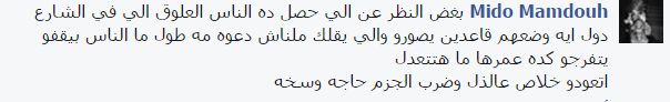 Mido Mamdouh-  : بغض النظر عن اللي حصل ده الناس اللي في الشارع دول إيه وضعهم؟ قاعدين يصوروا واللي يقلك ملناش دعوة ماهو طول ما الناس بيقفو يتفرجوا كده عمرها ماهتتعدل..اتعودوا خلاص عالذل وضرب الجزم.