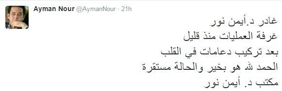 ونشر مكتب أيمن نور -عبر صفحته على موقع التواصل الاجتماعي “تويتر”- أنه بخير، وأن حالته مستقرة.