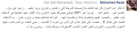 Mohamed Reda- : أنا فاكر أيام الإخوان كان فيه ائتلاف بتاع ضباط الشرطة اللي زعلانين وعاوزين يربوا دقنهم، راحوا فين دول .. غطسوا فين .. اختفوا فيه … خرسوا فين ؟؟!!!! دلوقتي حضرتك بتقول الإخوان ولاد الكلب عينوا بلطجية في الداخلية.. طب عظيم .. ماتقبضوا عليهم وتنفخوهم ياباشا وخلصونا منهم .. انتوا ليه بتعاملوهم بحنية وذوق وحنان .. ده الداخلية قابضة على أطفال !! .. قبضت على طفل عشان كان لابس تي شيرت لا للتعذيب .. يعني الحنية دي لناس فاسدة عينها الإخوان الفاسدين والإجرام والعين الحمرا للشعب ؟! ينفع كده برضك ياباشا .. يرضى ربنا ده