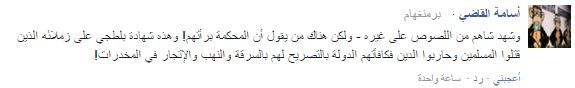– أسامة القاضي: وشهد شاهد من اللصوص على غيره – ولكن هناك من يقول أن المحكمة برأتهم! وهذه شهادة بلطجي على زملائه الذين قتلوا المسلمين وحاربوا الدين فكافأتهم الدولة بالتصريح لهم بالسرقة والنهب والاتجار في المخدرات!.