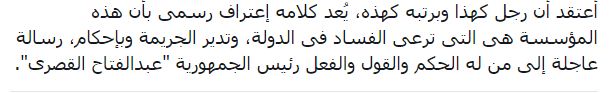 Mohamed Elzyiat- : أعتقد أن رجلًا كهذا وبرتبة كهذه، يُعد كلامه اعترافًا رسميًا بأن هذه المؤسسة هي التي ترعى الفساد في الدولة، وتدير الجريمة وبإحكام، رسالة عاجلة إلى من له الحكم والقول والفعل رئيس الجمهورية “عبدالفتاح القصري”