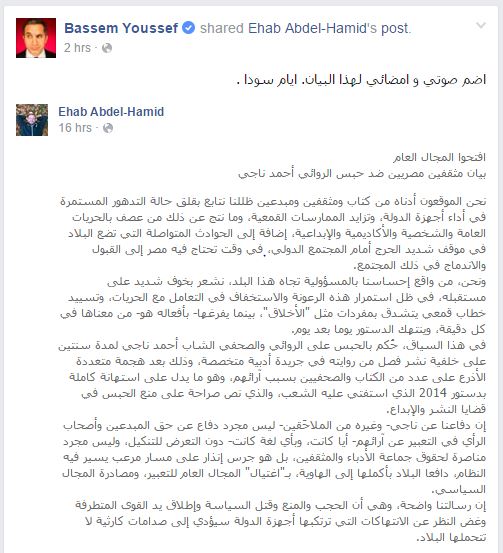 نشر مقدم البرامج الساخر الدكتور باسم يوسف، تضامنه مع بيان وقع عليه مثقفون مصر، ضد حبس الصحفى أحمد ناجى، وذلك عبر صفحته الرسمية بموقع التواصل الاجتماعي "فيس بوك".