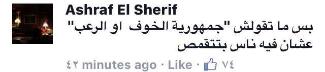 وعلق أشرف الشريف على منشور بهجت:”بس ما تقولش “جمهورية الخوف أو الرعب” عشان فيه ناس بتتفمص”.