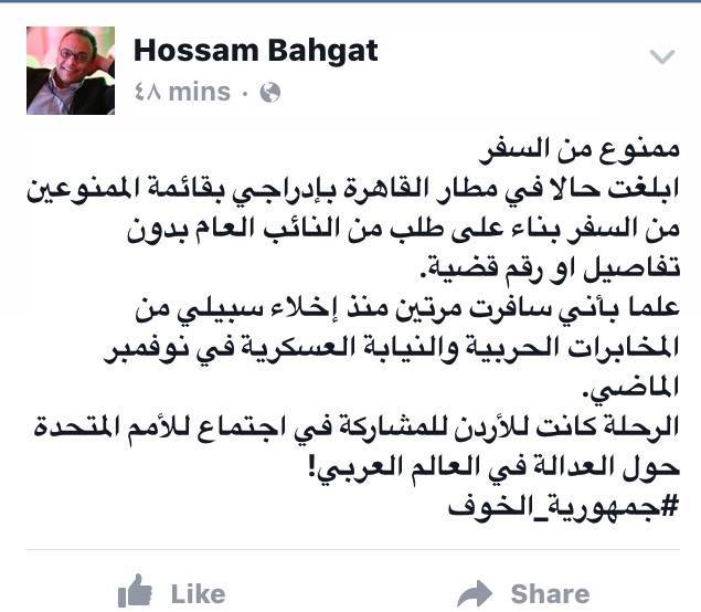 وأضاف بهجت فى تدوينه له على صفحته الشخصية بموقع التواصل الاجتماعي “فيس بوك”، قائلاً: “علما بأني سافرت مرتين منذ إخلاء سبيلي من المخابرات الحربية والنيابة العسكرية في نوفمبر الماضي”.