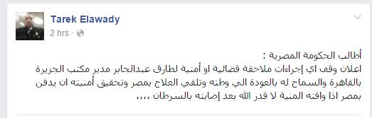 كما طالب بالسماح له بالعودة إلى مصر وتلقي العلاج، بعد أن أعلن إصابته بسرطان المعدة، وأيضًا السماح بدفنه في مصر تحقيقا لأمنيته.