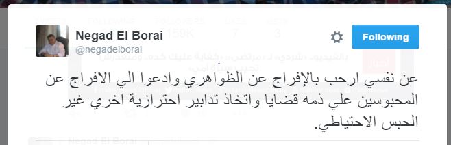 رحب الحقوقي نجاد البرعي، بقرار إخلاء سبيل محمد الظواهري شقيق أيمن الظواهري زعيم القاعدة، وذلك خلال تغريدة نشرها عبر حسابه الشخصي بموقع التغريدات القصيرة “تويتر”.