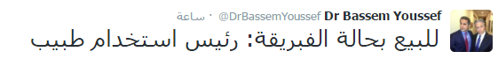 وكتب باسم يوسف في تغريدة له عبر حسابه الشخصي، بموقع التغريدات القصيرة “تويتر”: “للبيع بحالة الفبريقة: رئيس استخدام طبيب”.