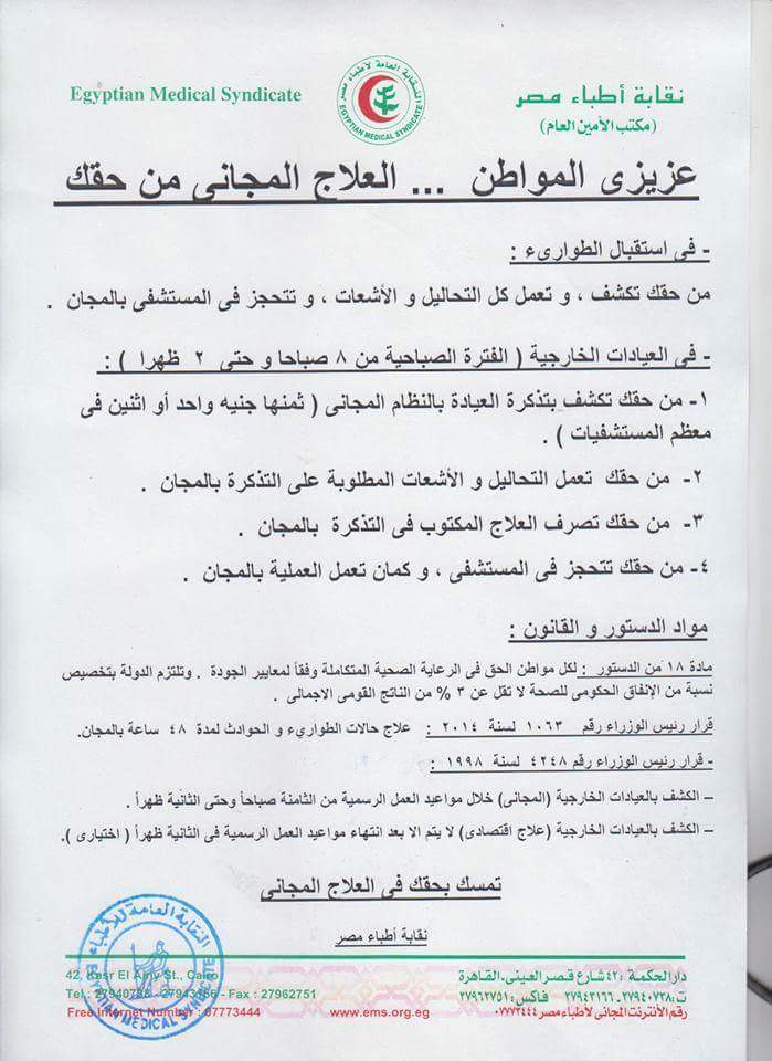 أكدت نقابة الأطباء المصرية، أن العلاج المجاني حق لكل مواطن.